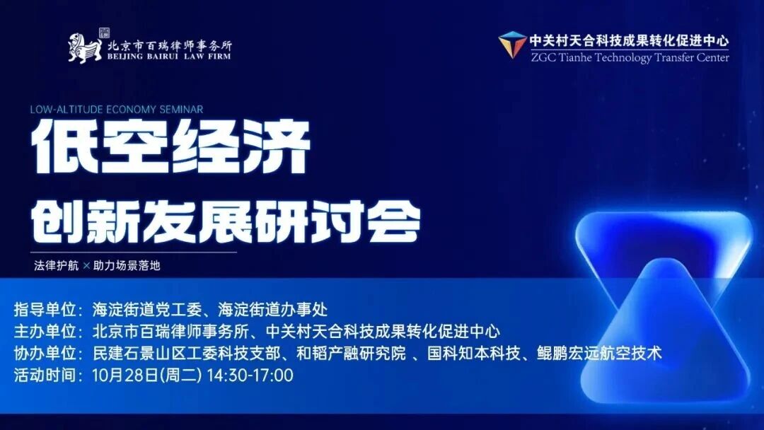 近日,由北京市百瑞律師事務(wù)所聯(lián)合中關(guān)村天合科技成果轉(zhuǎn)化促進(jìn)中心主辦,海淀街道黨工委指導(dǎo),和韜產(chǎn)融研究院、民建石景山區(qū)工委科技支部、鯤鵬宏遠(yuǎn)航空技術(shù)有限公司共同協(xié)辦的 “低空經(jīng)濟(jì)創(chuàng)新發(fā)展研討會(huì)” 在百瑞律所成功舉辦。本次研討會(huì)以 “法律護(hù)航?助力場(chǎng)景落地” 為主題,匯聚低空經(jīng)濟(jì)領(lǐng)域?qū)<覍W(xué)者、企業(yè)領(lǐng)導(dǎo)及行業(yè)同仁,圍繞產(chǎn)業(yè)協(xié)同、科技轉(zhuǎn)化、合規(guī)保障等關(guān)鍵議題展開深度交流。more -